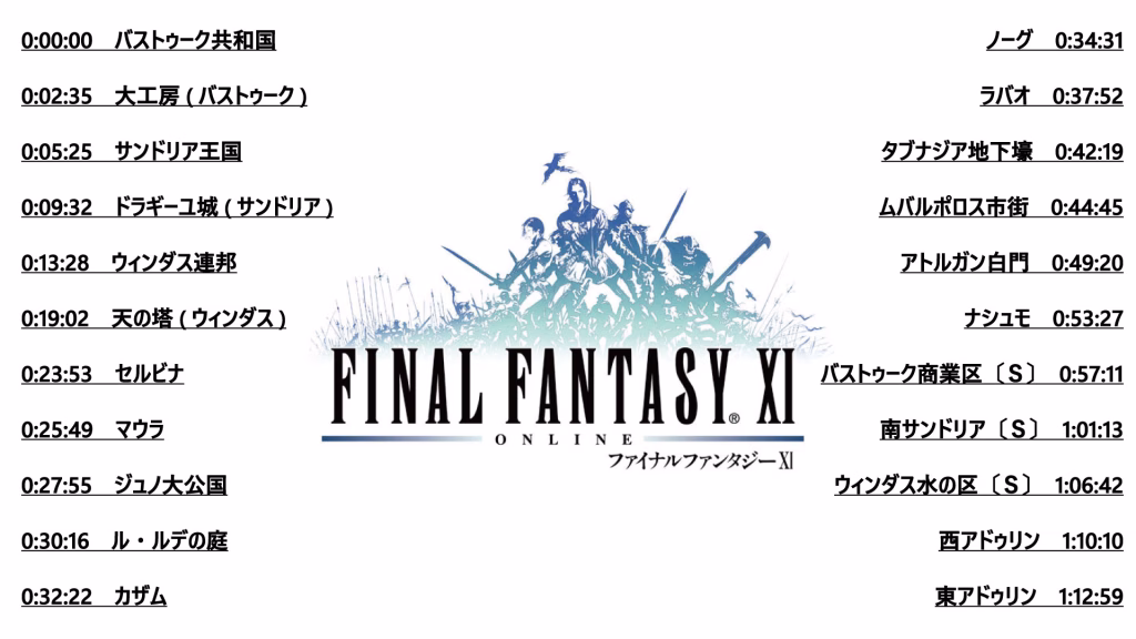 フィールドの音楽も好きだし作業用感というか適性はむしろそっちにあるような気もしますが、全エリア流したら長すぎて流石にダレるような気がしますので、街の音楽ぐらい一周が短ければ…で、1時間超ですから…w