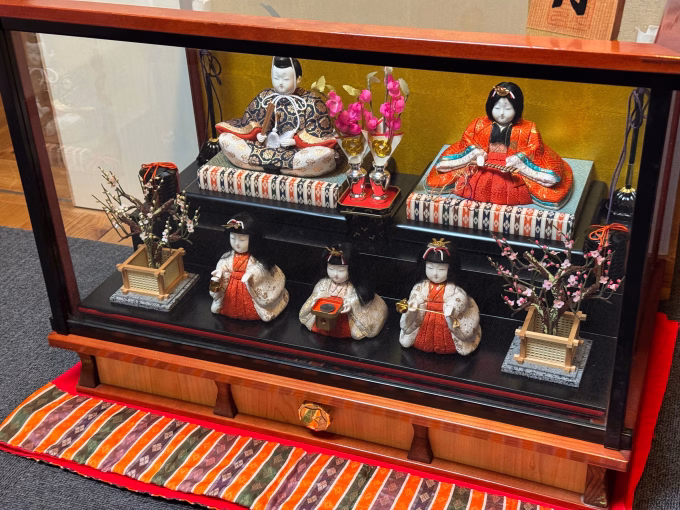 男雛と女雛の正面と間にあるのは三宝揃、三宝の上に瓶子(へいし)を乗せ、熨斗をし梅の花を飾り長寿を願うそうです。