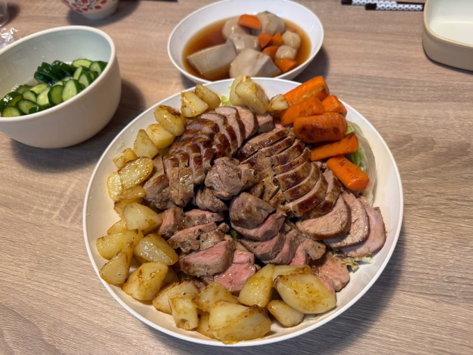 ほぼ1時間、オーブンでやれと言われればそれまでですが、最初の油を拭いたあとは美味しい肉汁と油でポテトや人参を焼きたいので無理です😊