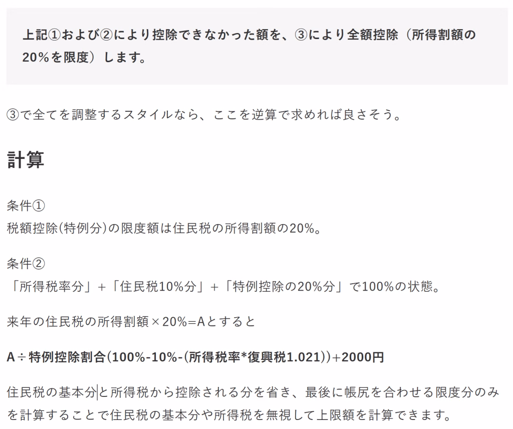 住民税の基本分と所得税から控除される分を省き、最後に帳尻を合わせる限度分のみを計算することで住民税の基本分や所得税を無視して上限額を計算できます。