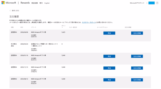 登録したのは2024年の8月、3カ月に一回ぐらいのペースで600円のアマギフをくれ続けるマイクロソフトさん。