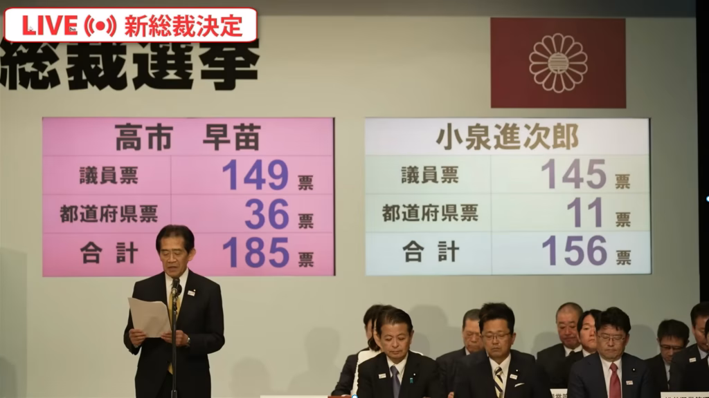 初回開票では林氏134票、高市氏183票、小泉氏164票と接戦でしたが、いわゆる「民意に近い」とされる都道府県票や党員算定票などの地方票では、高市氏優勢。