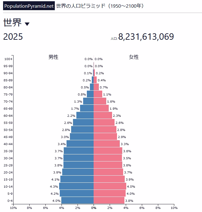 ↓は2025年の人口ピラミッド(populationpyramidより)です。